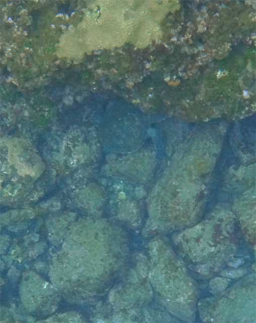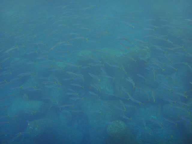 慣れてきたところで場所を移して沖にも出られる八重根に行って、若干のうねりと白濁りもあり、夏に比べ魚は少なめでもありますが、今日は運よく湾内にちいさなアオウミガメが寝ていたり、たくさんのムロアジの群れが行ったり来たりもしていたり、