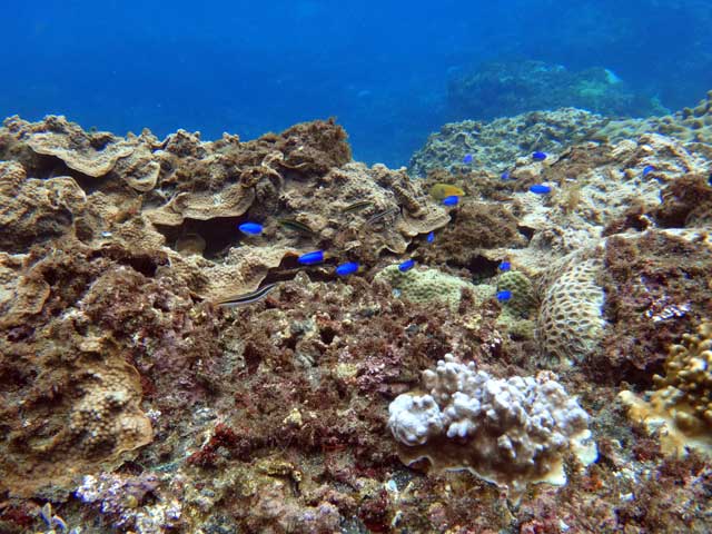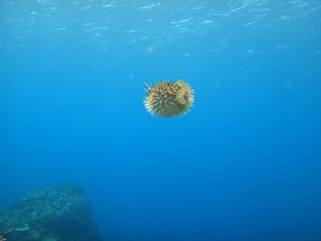 ほかにも熱帯魚っぽさ満点のツノダシや、綺麗な青色のソラスズメダイ、ハリセンボンもチョロチョロ泳いでいたりもして、すっきり抜けてる綺麗な海を楽しんで頂けました。