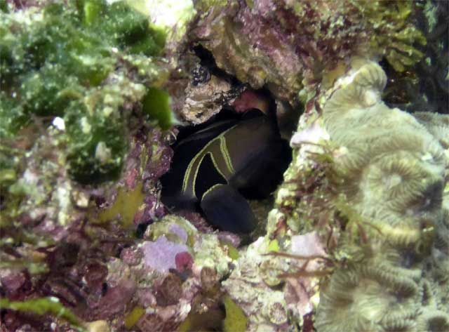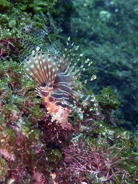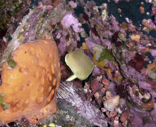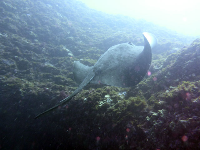 全体的に白濁りではありますが、南潮がかかってきているところはそこまで冷たい水もなく、ヒレナガカンパチが周ってきていたり、マダラエイがやってきたりもして、あとはキリンミノやゴマチョウチョウウオなんかもおりました。