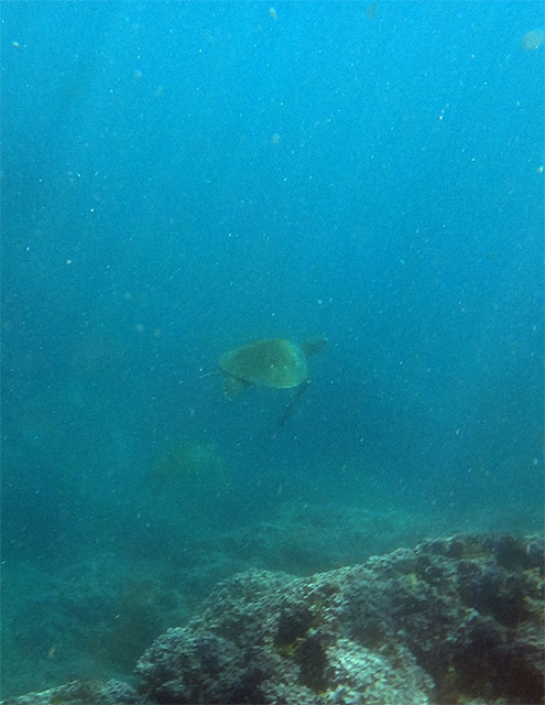なかなかスノーケリングにはきつい透明度ではありますが。、沖に行かないとアオウミガメには逢える確率もあんまりないので、カメだけ狙って沖まで行って、