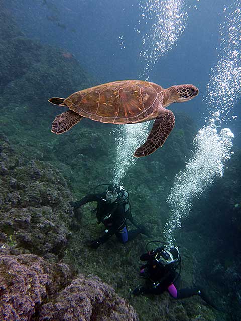 湾内の比較的穏やかなところで、練習をしてあとはゆっくり潜ってきたり。ちょっと小さめでもありますが、アオウミガメもしっかり見られ、