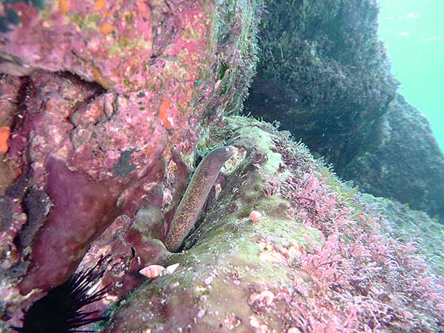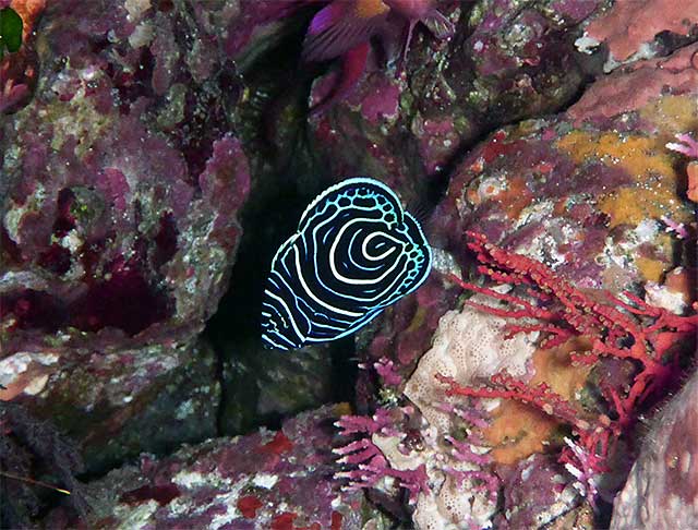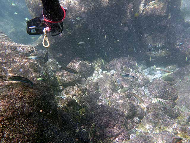 あとは、午後からナズマドにも潜ってみて。大物出ている情報もあったりしましたが、サクッと潜って当たらずで、沖の根で待ってもみましたが、あんまり気配も感じらず。タテジマキンチャクダイの子どもとか、サビウツボがみょーんと伸びてるをちょい撮りしてみたり。どうやら午前中にでていたみたいですね・・・