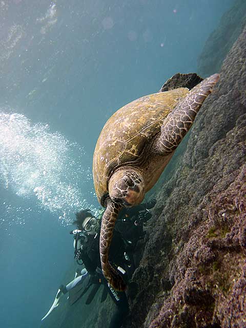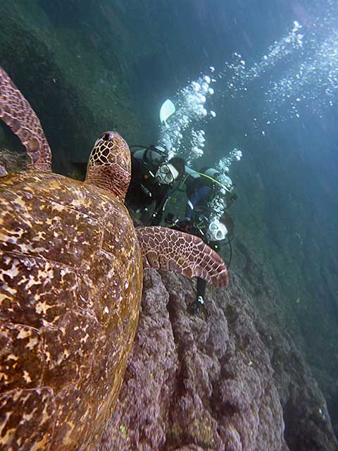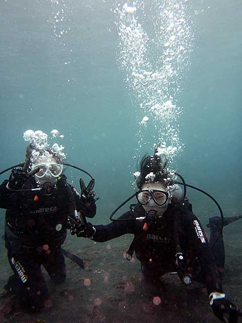 初めはちょっと呼吸が落ち着かない感じでもありましたが、後半は余裕もでてきて、沖ではウミガメにもたくさん逢えたりして、秋の八丈島で体験ダイビングを楽しんで頂けました。