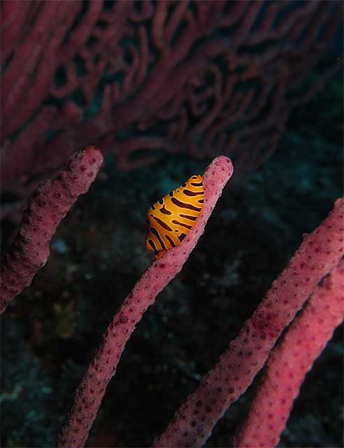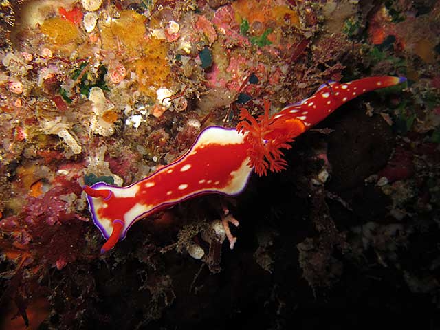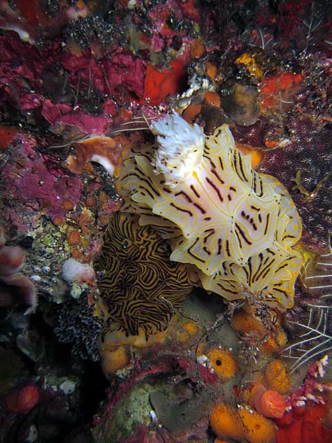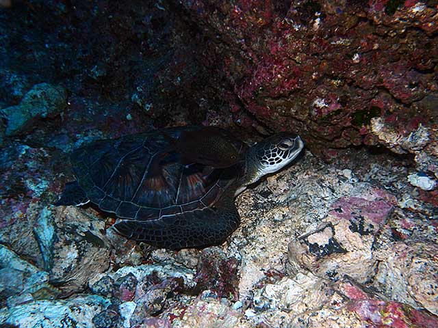 ほかにもトラフケボリやパイナップルウミウシが2匹で寄り添っていたり、シロボシスズメダイに攻撃されまくっているがまったく動じてないアオウミガメなんかもおりました。