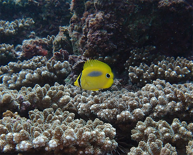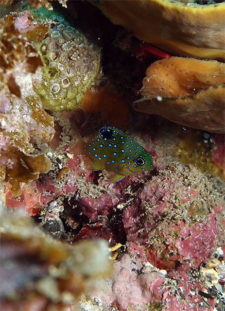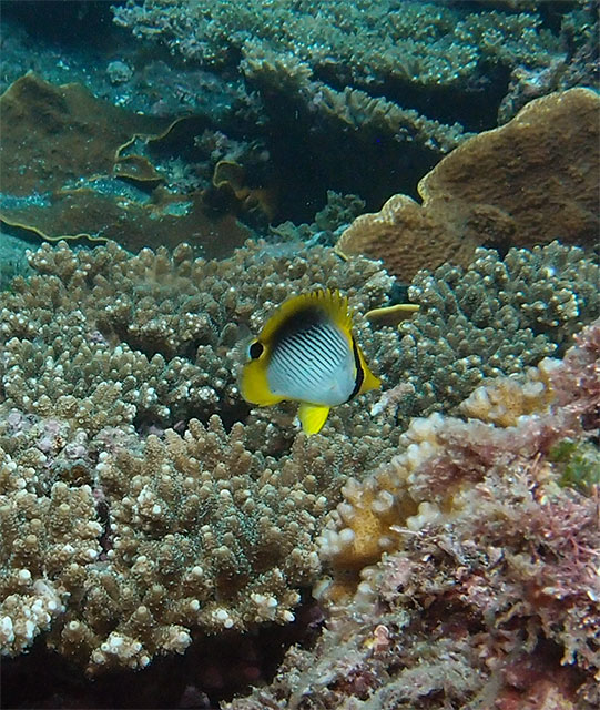 チョロチョロとすぐに隠れるルリホシスズメダイの子どもや、アケボノチョウチョウウオの子どもに、ゴマチョウチョウウオなんかもいたりして、