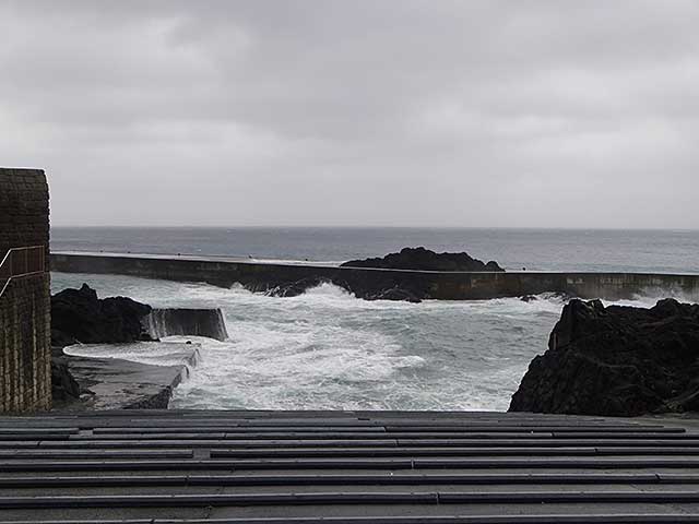 台風接近に伴いうねりも大きくなってきていて、海は全体的に大荒れとなっており、本日は定期船、飛行機共に全便欠航となっております。