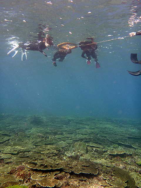 慣れてきたら、ゆっくり沖まで出ていって、時折大きなうねりも入ってきていましたが、沖に出れば水も綺麗で、大小たくさんアオウミガメもおりまして、うねりに負けずにとっても近くで見たりして、