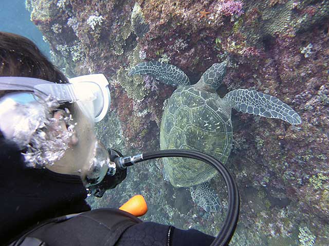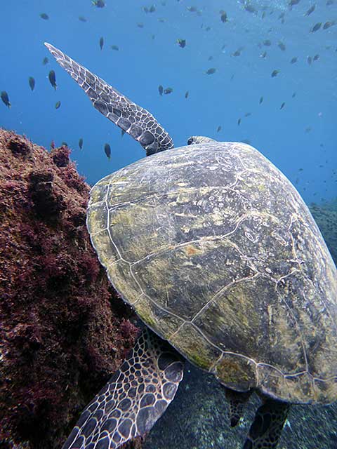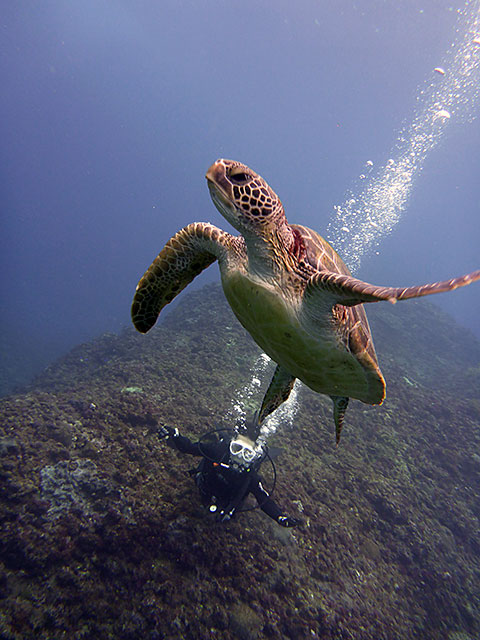 沖はうねりもあって若干の白濁りもありましたが、グルッと周って、ムロアジやニザダイなんかの集まってるのを見たりして、あとは、泳いでるカメにゆっくり近づいてみたりもして。