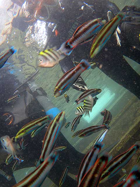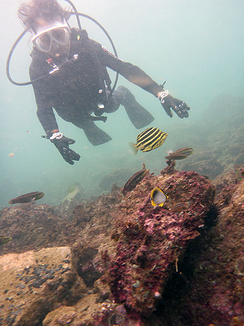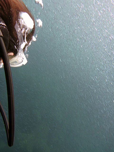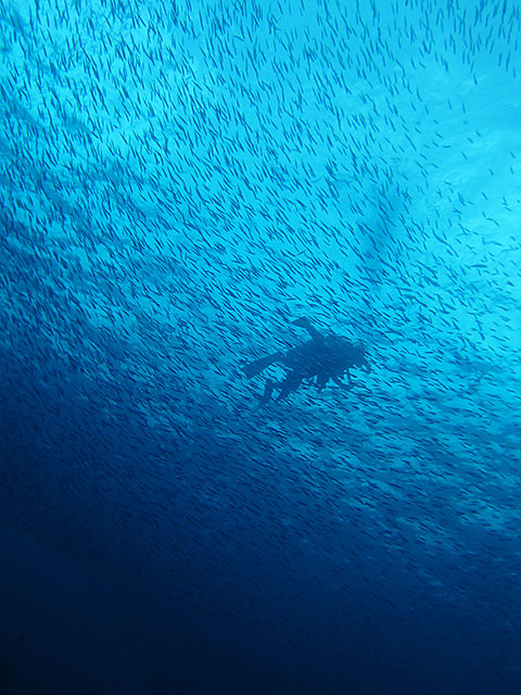 体験ダイビングはショップで器材や潜り方の説明をしたあとに、足のつくところで練習をして。夏に比べれば数は少なくなってはいるものの、ムロアジやキビナゴなんかもチョロっと入っていたりして、ナンヨウツバメウオの子どもや、大きなハマフエフキなんかを見つつ浅場で海に慣れて頂いて、