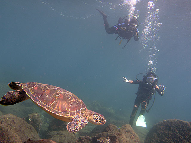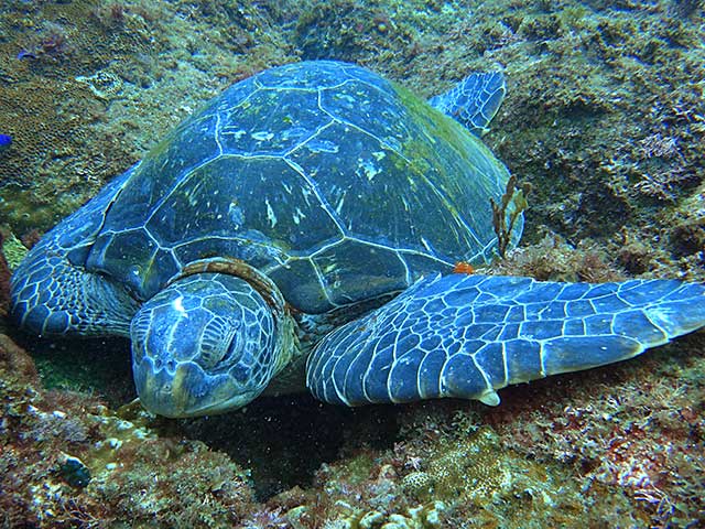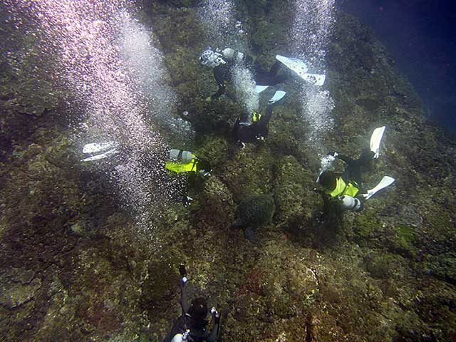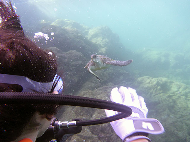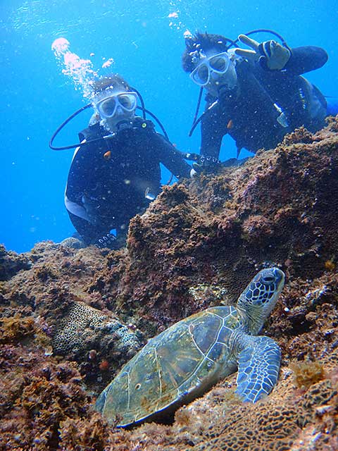 体験ダイビングでも、運よく湾内にアオウミガメがやってきたりで、耳抜きが少しやりづらく、あまり深くには潜れませんでしたが、正面から向かってくるカメをじっくり近くで見てみたり、