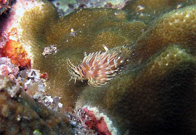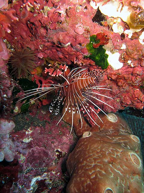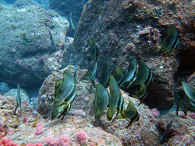 ナズマドは流れも止まってのんびりな感じで、アオウミガメにカンパチが付きまとっていたり、アブラヤッコやレンテンヤッコ、タテジマキンチャクダイの小さいやつや、ネッタイミノカサゴやキリンミノの小さいやつに、キンギョハナダイやキホシスズメダイがワーッと群れていたりもして、暖かで水の綺麗な穏やかな海を楽しんで頂きました。
