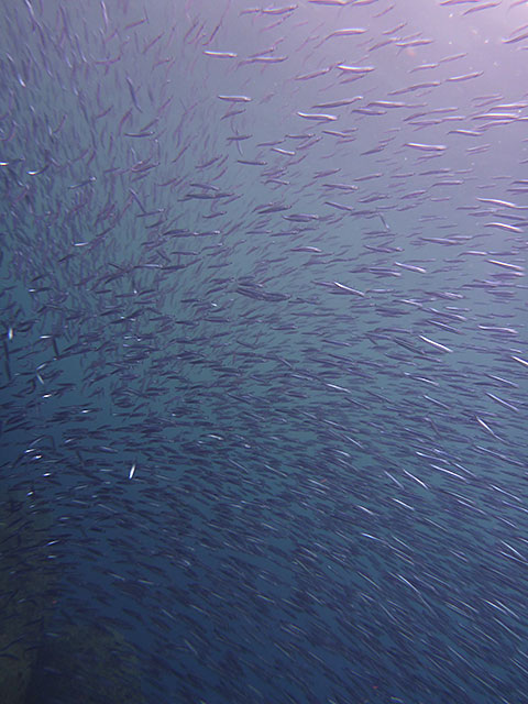 ナズマドは南からの潮が速くもありましたが、カンパチやツムブリ、スマなんかがキビナゴ狙ってワーッと来たり、ユウゼンもたくさん見られ、ちょっと沖にはイロブダイの子どもに、入ってすぐの暗いところにはタテジマキンチャクダイの子どもなんかもいたりして。