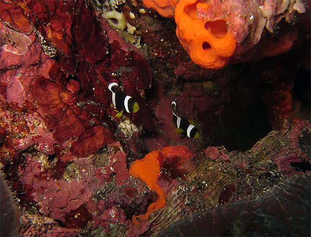 雨の影響で岸近くは濁ってはいるものの、キビナゴたくさんで、沖まで出れば水も綺麗に抜けていて、初八丈島ということで、まずはじっくりアオウミガメを見て頂き、アーチを抜けてクマノミも見てみたり。