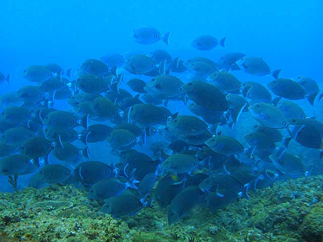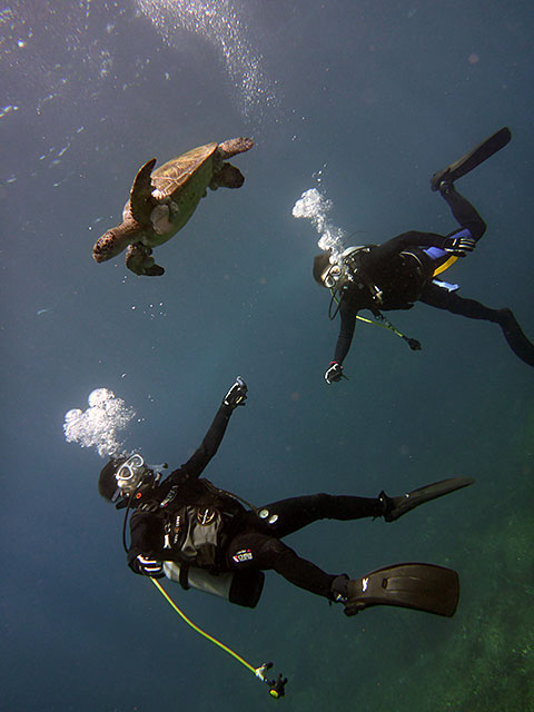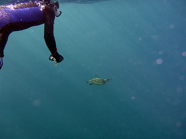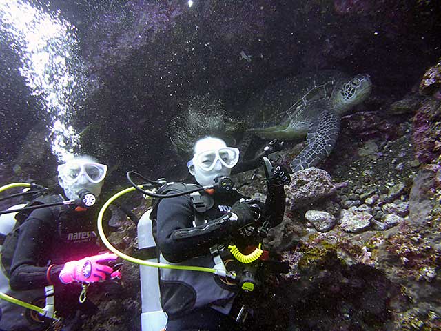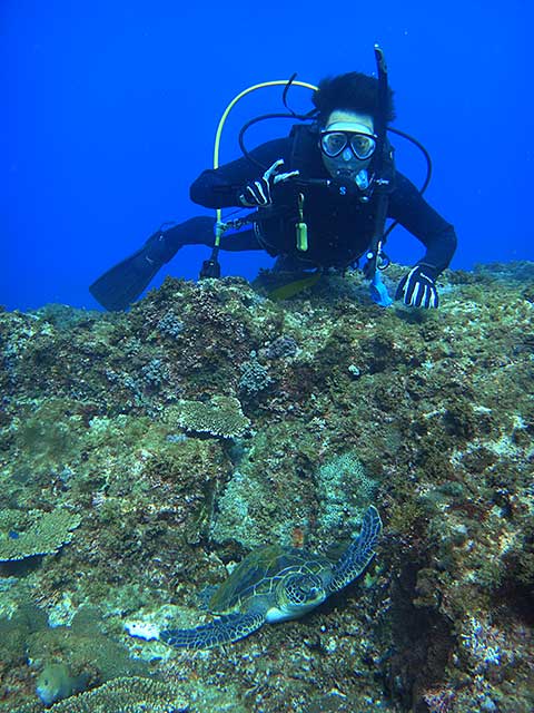 講習も終わりに近づき、海の中でも余裕がでてきていて、ニザダイの群れに近づいたり、ハマフエフキやアオウミガメと一緒に泳いで、