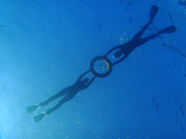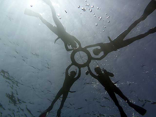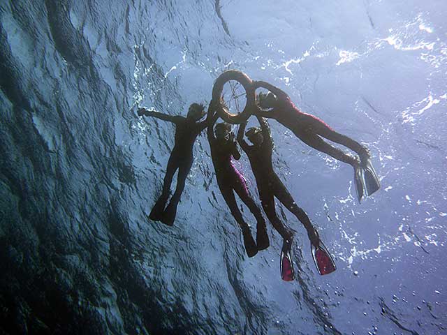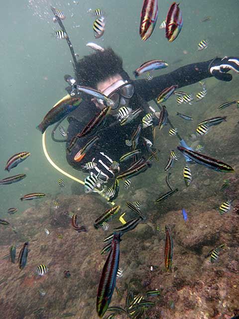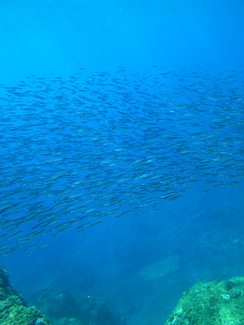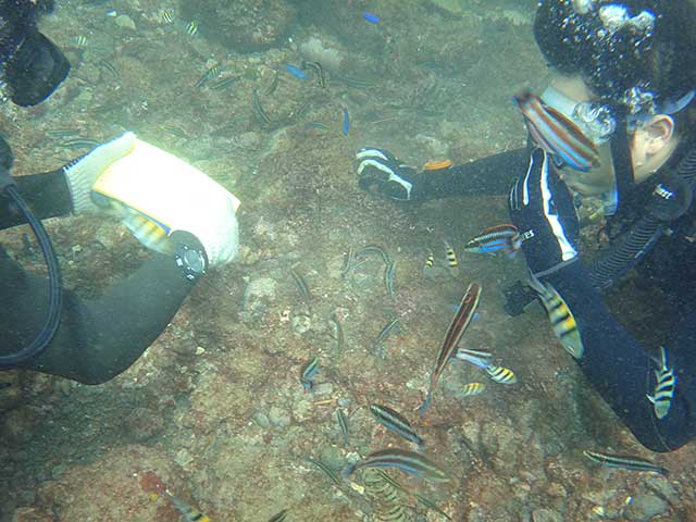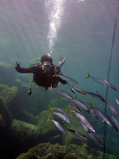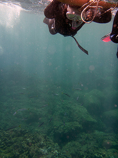 入ればたくさんの魚達がワラワラ寄ってきて、魚をみながらいろいろスキルをやって、気持ちの良い青空の下、穏やかな海の中で楽しみながらの講習です。