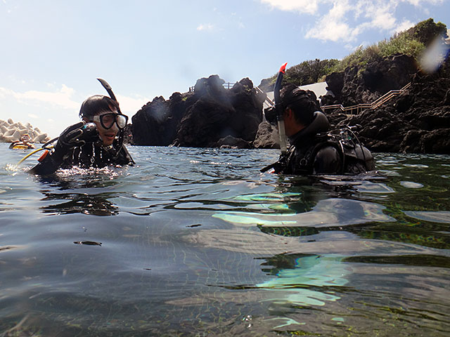 午前中は、ショップで学科をすませ、午後からは限定水域ダイブでタイドプールに行ってみて。夏休みも終わり、ひとも少ない海を楽しみながら講習をして。