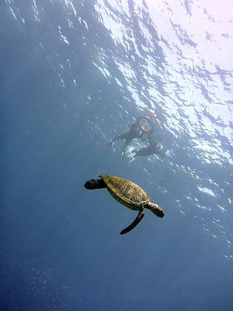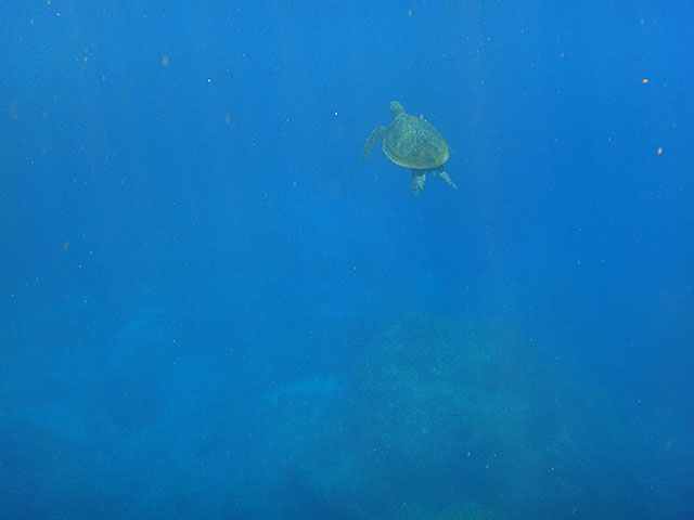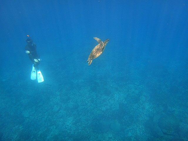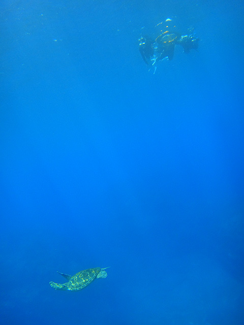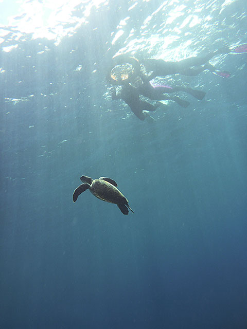 体験ダイビングは、ショップで色々説明をして、足のつくところもある穏やかなタイドプールで練習もして、海にも慣れてきたところで、場所を移して沖まで行ってみましたが、途中、大きなカメを見たところで、口から水が入ってくるのが気になってしまい、ちょっと不安になってしまったらしく、ゆっくりのんびりダイビングとは行きませんでしたが、いろいろな魚も見られ、なんとかアオウミガメも見られたり、
