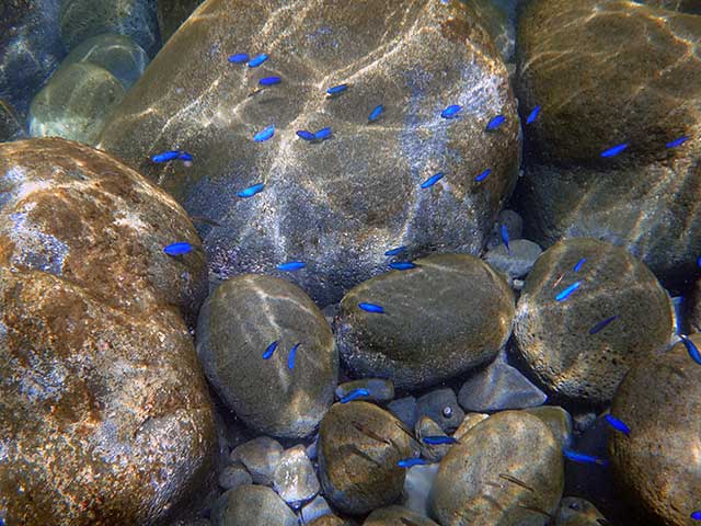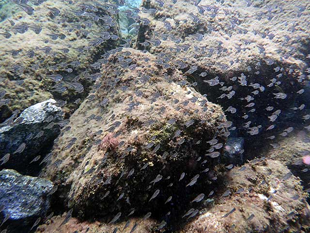 何度か体験ダイビングもしたことがあるとのことでしたので、練習もサクッと終わり、青がキレイなソラスズメダイやとっても大きなハマフエフキに、たくさん群れてるムロアジやタカベの子ども、アオリイカの子ども達や、体が透けてるハタンポの子ども達なんかも見たりして、のんびりじっくり夏の海を楽しんで頂けました。