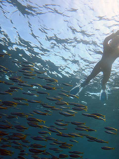 ショップで説明をしたあとに、足のつくところもあるタイドプールで練習をして、水面はパシャついていましたが、入ってしまえばそんなにうねりもひどくもなくて、色鮮やかな魚達を見ながら、水の綺麗な沖まででていき、