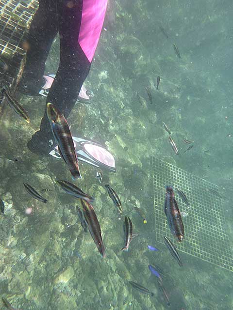 お食事中のアオウミガメをたくさん見たり、ワーッと群れてるタカベの子どもを見てみたり、大きなハマフエフキは、振り向けばあとをついてくる感じで、
