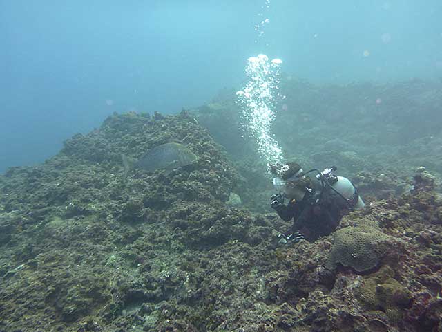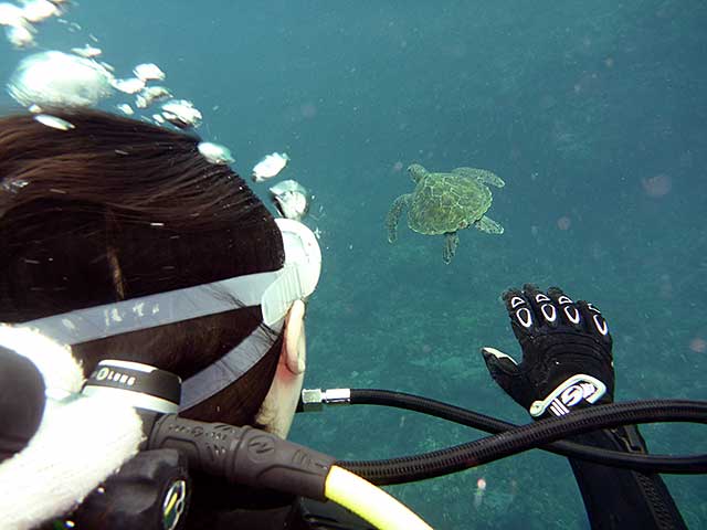 雲も低く下がってきており、スッキリとはしない空模様でもありましたが、サンゴの広がる海の中には、綺麗な魚もたくさんで、沖まで行けばアオウミガメも見られたり、
