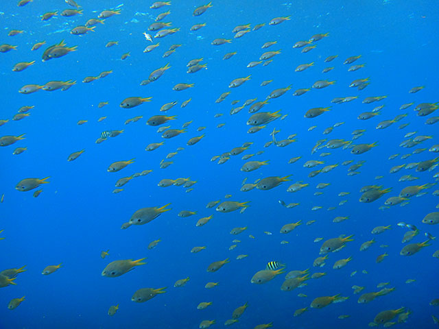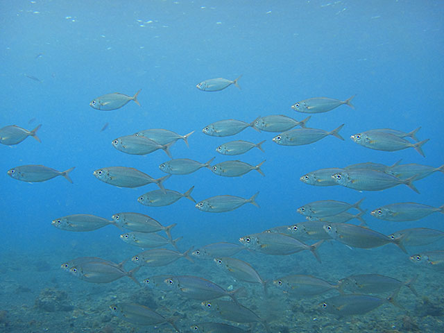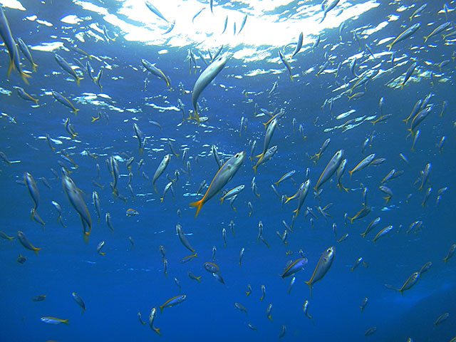 ムロアジ以外のアジっぽいやつらも群れていて、大きなハマフエフキに、青が綺麗なソラスズメダイ、黄色と黒しましま模様のツノダシなんかもいたりして、