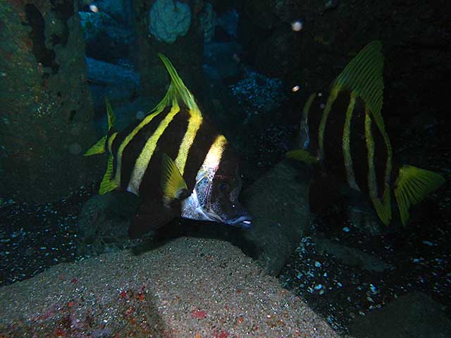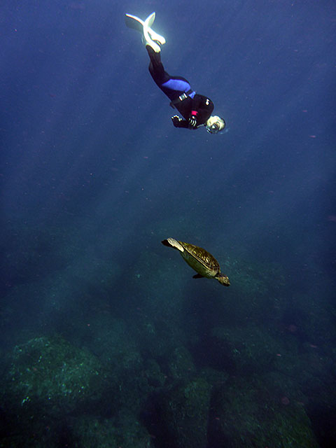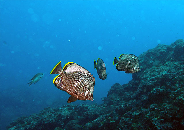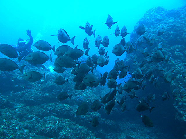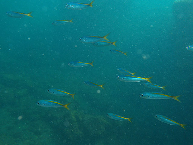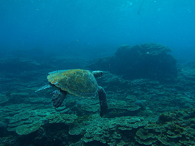 船と飛行機が欠航しているので人の少ないこともあってか、午前中はアオウミガメがワラワラみんなでお食事中、午後からは小さいやつらをパラッと見 かけたり、ニザダイなんかも群れでサーっと通り過ぎたり、ヒレナガカンパチの中くらいのやつらもチョロチョロ見られたり、アーチの下にはテングダイにレン テンヤッコにサザナミヤッコもおりまして、