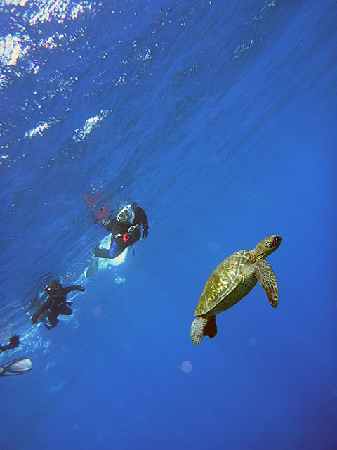 午後からは、ボートを出して蒼い海で泳いでみて、アオウミガメもたくさん見られ、台風うねりはあり、ちょっと波酔いもしちゃったりする方もいらっしゃいましたが、夏の海を楽しんで頂けました。