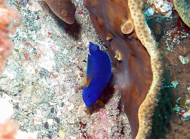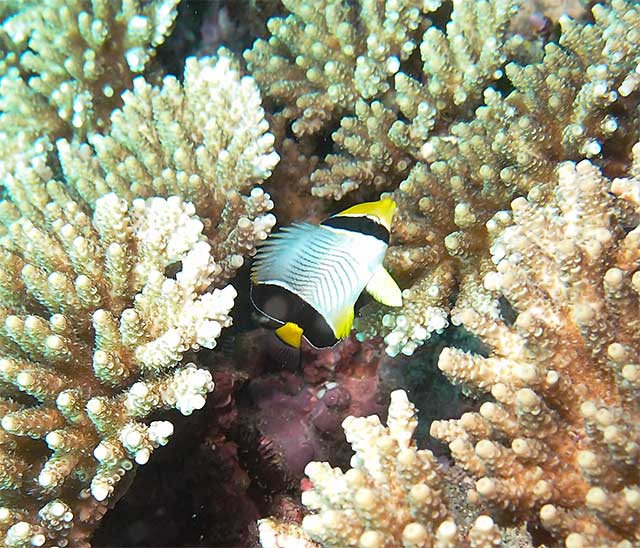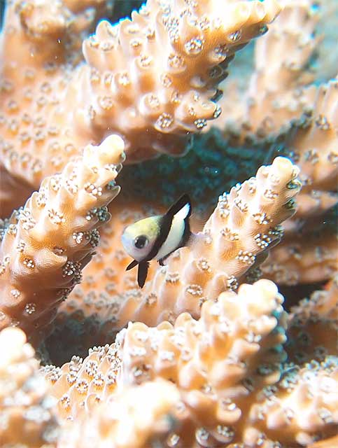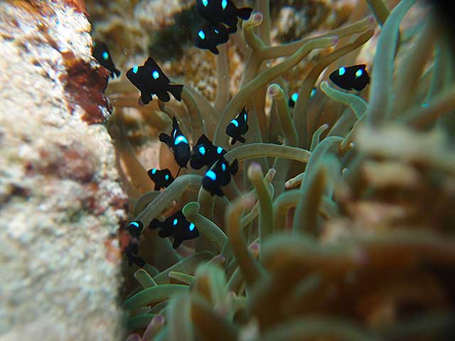 エントリー口近くのサンゴにはルリヤッコやゴマチョウチョウウオの子どもにクロベラの子ども、サンゴが広がる浅いところにはヤリカタギの子どもなんかもいたりして、