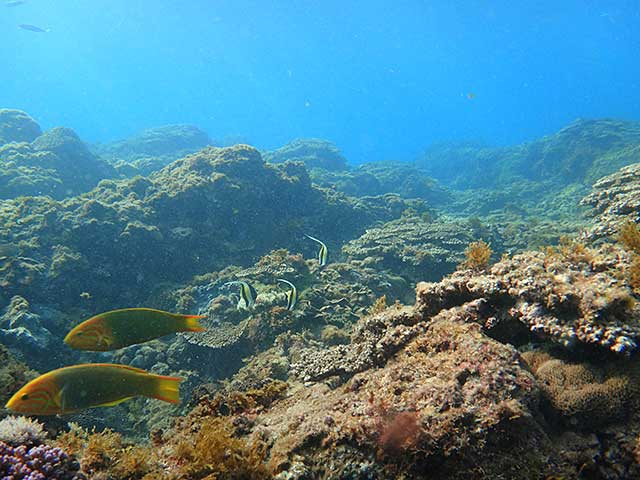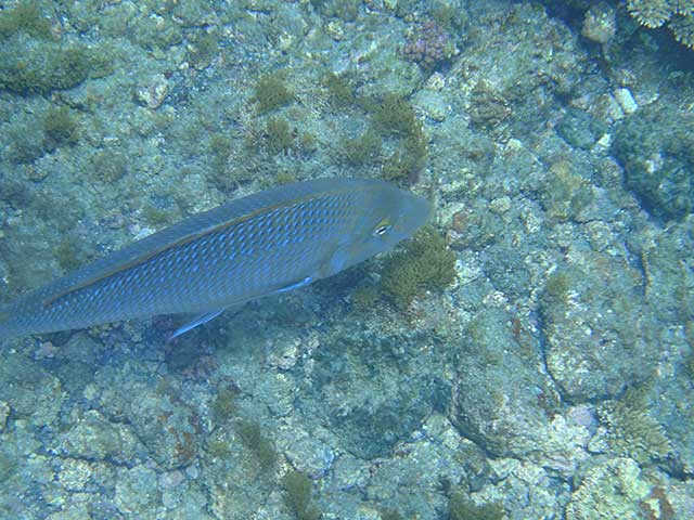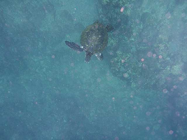 色とりどりの魚達や、ムロアジの群れに囲まれ、こちらもアオウミガメに出会えたり。そういや、手前の落ち込みの前くらいの浅いところにルリヤッコっぽいやつがチラッといたりもして。