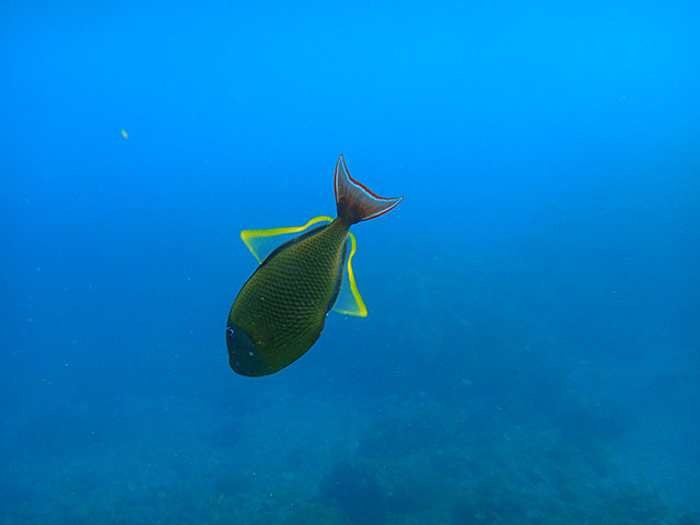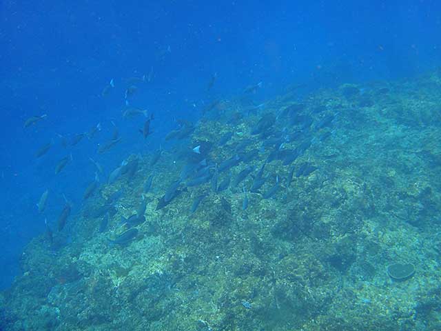 あとは、こちらのうねりに負けずに体験ダイビングで、白濁りのムロアジだらけの浅場から、水の綺麗な沖まで行って、青がキレイなソラスズメダイや、ツノダシなんかも見つつ、