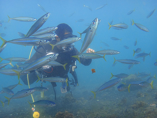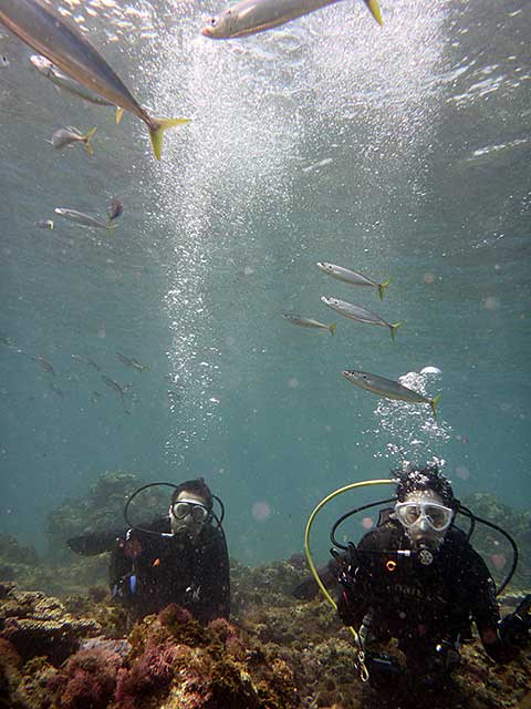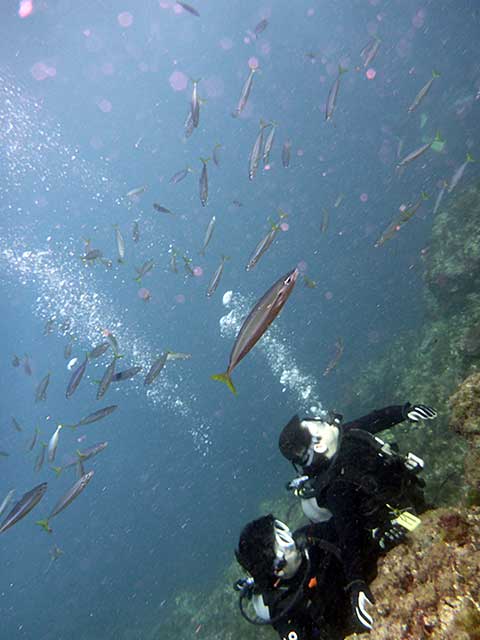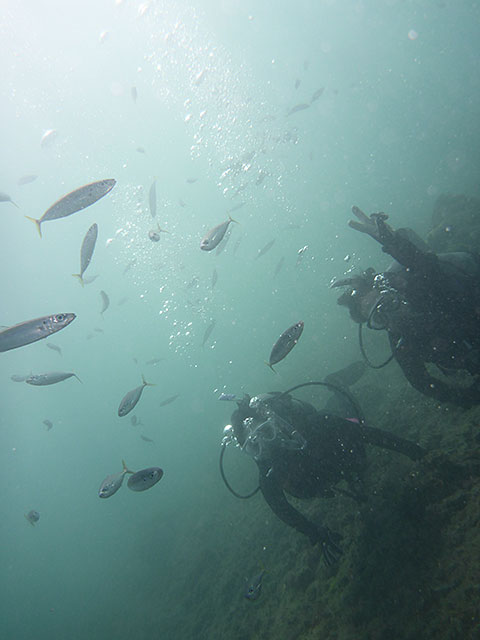 初めての体験ダイビングの方達は、ゆっくり浅場でムロアジ見ながら海に慣れて頂いて、うねりも入ってきていて、手前は少し濁りも出ていましたが、水の綺麗なところまで出ていって、