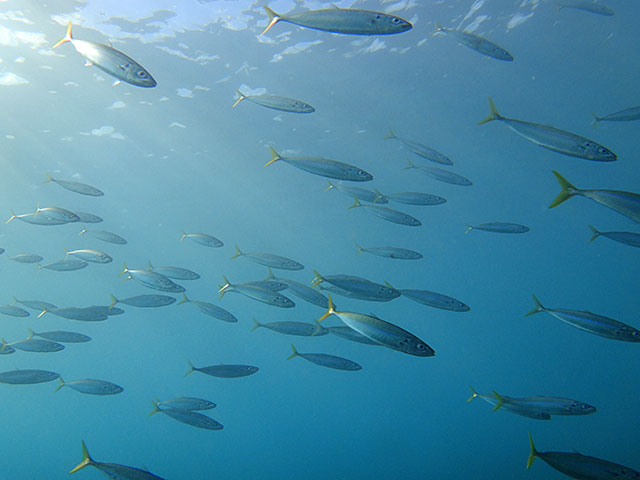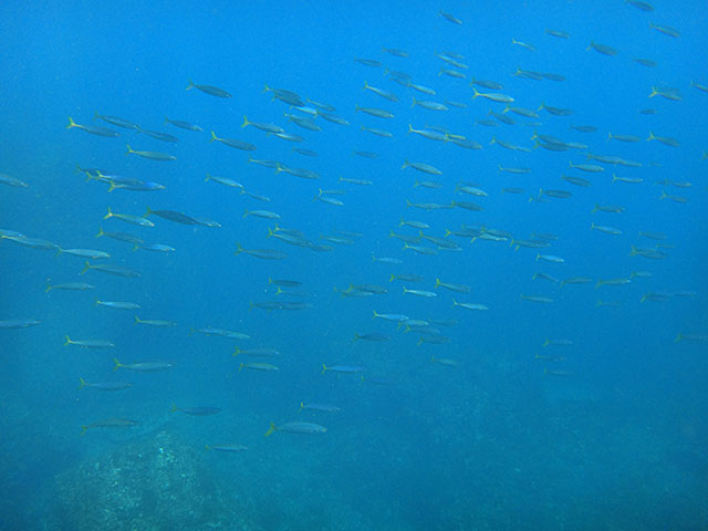 手前はうねりの影響で白濁りしておりましたが、たくさんのムロアジは変わらずで、入ってすぐから魚だらけな感じで、ご家族連れの方はゆっくり海を楽しんで頂き、手前でいろいろ見たりして。スノーケリング経験もある方達はちょっと沖まで行ってみて、水の綺麗なところでウミガメやムロアジやメジナなんかの群れてるやつらを見てみたり。