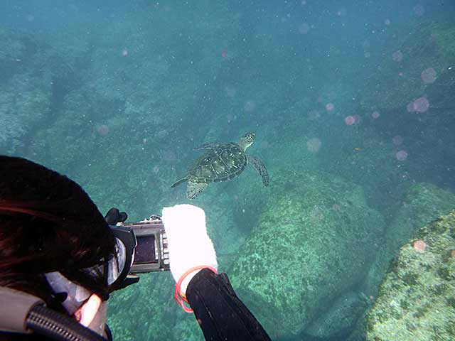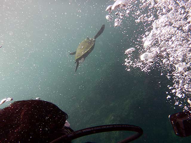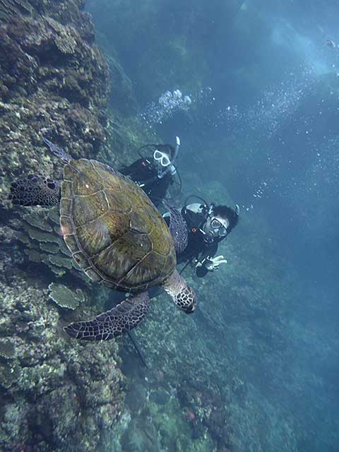Cカードお持ちの方と体験ダイビング経験者の方は、サクッと練習をすませ、グルッと沖まで周っていって。蒼い海に魚もたくさんで、アオウミガメもたくさん見られたり、