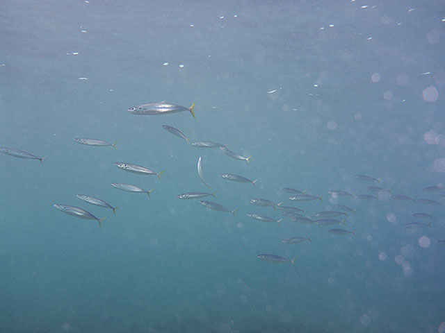 午前中はちょっと雲が多めでもありましたが、徐々に日差しも出てきて、海に入っている間は明るい感じで。足のつくところで練習をして、時折ムロアジなんかも足元を通り過ぎながら、ゆっくり沖まで出ていって、