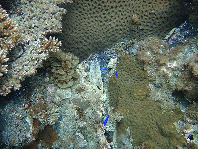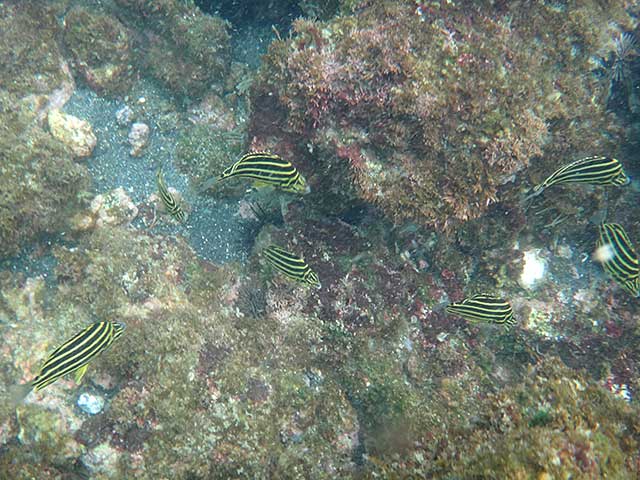 セジロノドグロベラにブチススキベラ、カンムリベラにツユベラ、スミツキベラにモンツキベラなんかのベラの子どももいろいろいたり、タキベラの大きなやつもおりまして、ほかにもフエダイがワラワラ集まっていたりで、流れもほとんどなく水もキレイで暖かな、夏の海が広がっておりました。