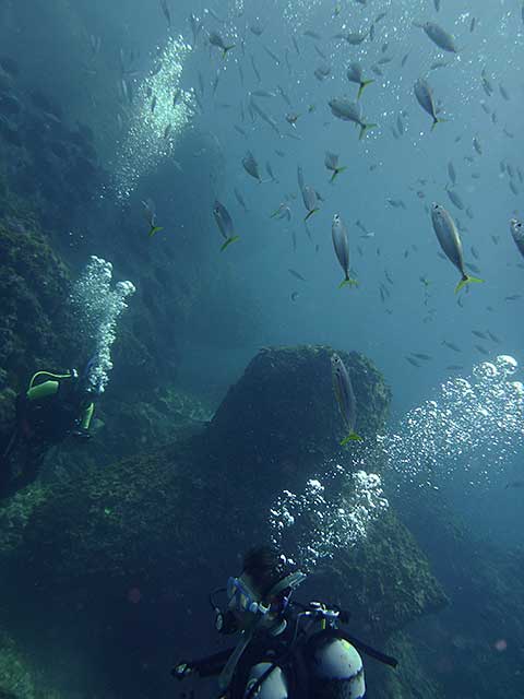 うねりは収まってきていたんで、濁りもそんなでもなく、ムロアジの群れやタカベの子ども達の群れなんかも通り過ぎ、波にも負けずに頑張った甲斐あって、アオウミガメも無事にみんなでゆっくり見られたり。