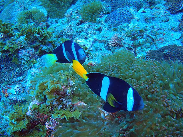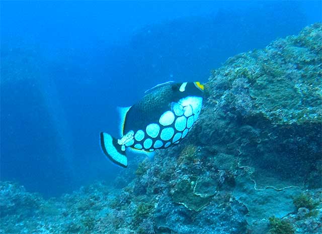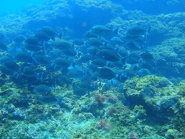 あとは八重根で、ゆっくり潜ってみたりして。手前は白濁りではありますが、ムロアジの群れは変わらわずワシャワシャおりまして、ミナミハコフグの子どもに、クマノミの子ども、ナガサキスズメダイやキホシスズメダイの子どもなんかも見たりして、あとは頭にコバンザメつけてちょんまげみたいになっているモンガラカワハギに、ツバメウオもボーっと泳いでいたり。