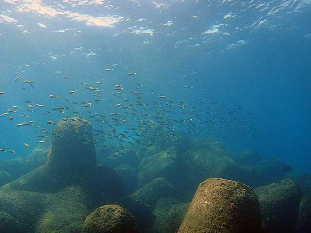 うねりは取れたものの、南からの風で水面付近はパシャついて、パッと見良くない八重根ではありましたが、入ればうねりもそんなでもなく、ムロアジやキビナゴ、タカベの子どももたくさんで、夏の海が広がって、岩の隙間にはミナミハコフグの子どもなんかもおりまして。