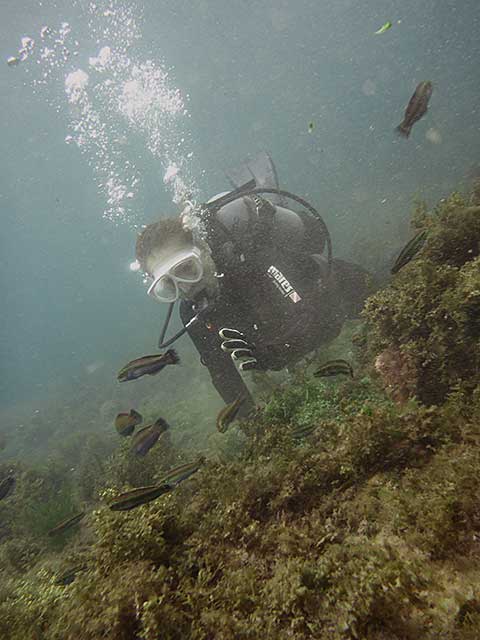 初めてのダイビングということで、ショップでしっかり説明をして、足のつく穏やかなタイドプールで練習で。ニシキベラやカゴガキダイに囲まれながら、呼吸や耳抜き、泳ぎ方なんかに慣れていき、ゴマサバの子どもやメアジっぽいのも群れていて、とっても近くでたくさん魚を見て頂いて。