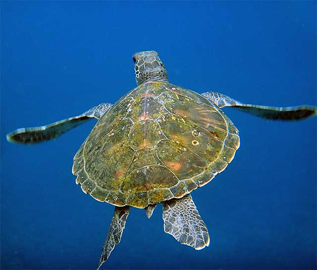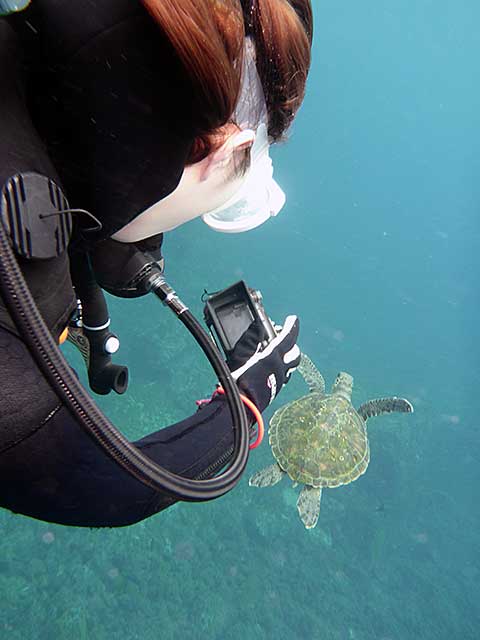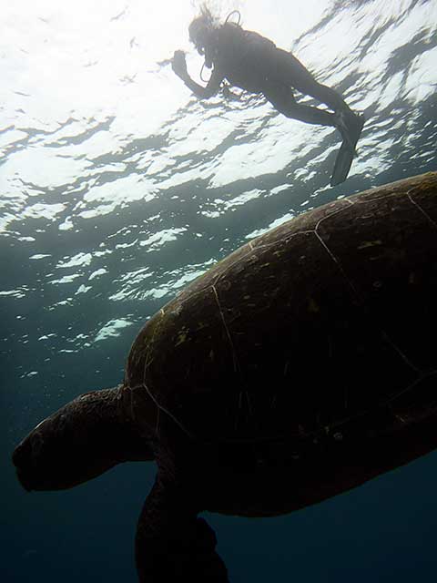 ダイバーも少ない海の中で、のんびりゆっくりアオウミガメと一緒に泳いで、寝ているカメや、呼吸をしに水面付近に上がっていくカメなんかも見られたり。たくさんのキラキラしているキビナゴの群れも見られ、海の中を楽しんで頂けました。